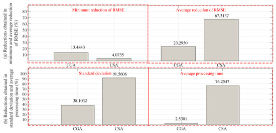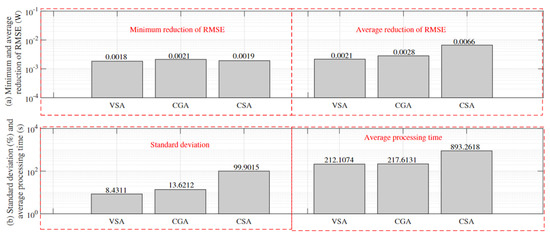 Reductions obtained by the VSA: (a) minimum and an average reduction of RMSE (%). (b) Standard deviation and average processing time (%).