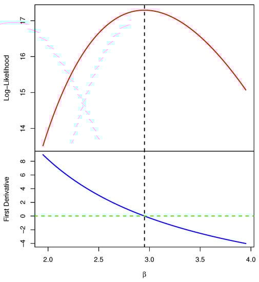 It is worth highlighting that Equation (15) is analytically impossible to solve. Therefore, acquiring the MLE in explicit form is challenging. The requisite estimate can be obtained using some numerical approaches, such as the Newton–Raphson method. Another approach to obtain the MLE of is to use the iterative process as mentioned by Pareek et al. [20]. Since the profile log-likelihood function of is unimodal as displayed in Figure 1, we can write , where