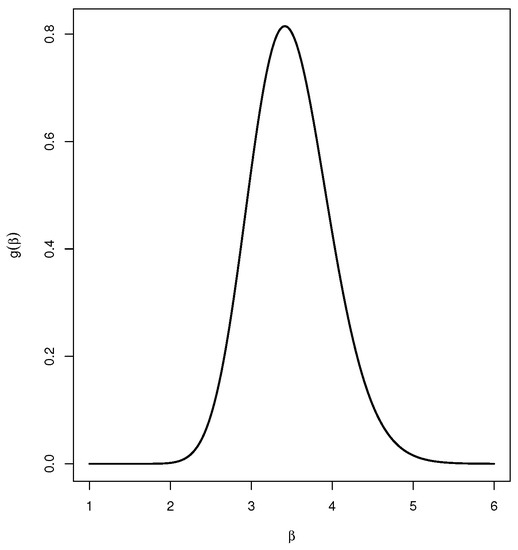 The conditional distribution of the parameter , which is provided by Equation (22), on the other hand, is unknown, but its plot shows that it has the same behavior as the normal distribution; see Figure 2. As a result, we consider creating samples from this distribution based on the Metropolis–Hastings (M-H) method.