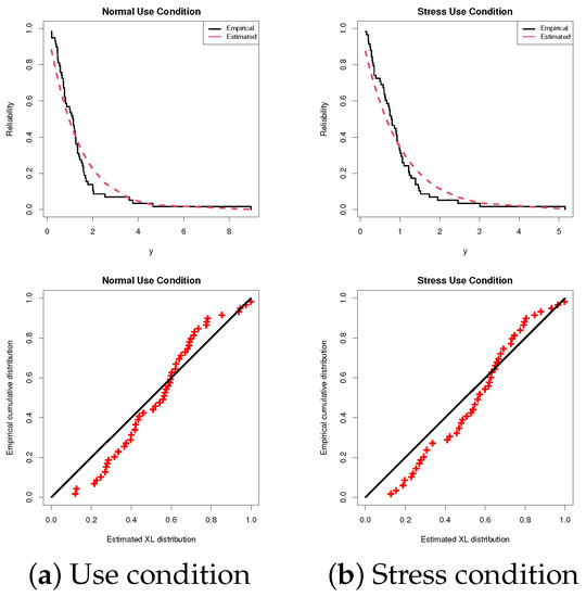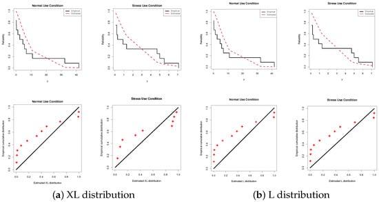 To check whether or not the XL distribution provides a proper fit to the insulating fluid data, the Kolmogorov–Smirnov (KS) statistic along with its p-value are considered. Briefly, using negative log-likelihood (NL), Akaike (A), consistent Akaike (CA), Bayesian (B) and Hannan–Quinn (HQ) information criteria, we compare the applicability of XL distribution with Lindley (L) distribution. From Table 1, to make this comparison, the MLE (standard error (St.E)) of XL (or L) parameter under normal use and accelerated stress data are calculated and reported in Table 2. It shows that the XL distribution has the smallest values of NL, A, CA, B, HQ, KS statistics and the highest p-value. As a result, the XL distribution provides a better fit than the L distribution for both given normal use and accelerated stress data sets. It is also indicates that the XL distribution fits the insulating fluid data well for both stress levels. Using the two data sets, in Figure 6, the fitted/empirical reliability functions and probability–probability (PP) plots for XL and L lifetime models are displayed. It shows that the proposed XL model offers a good fit to the insulating fluid data sets and supports the same goodness-of-fit findings.