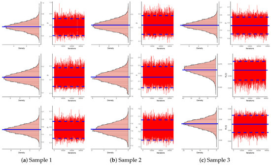 One of the main issues when using the MCMC procedure is how to prove the convergence of Markovian chains. For this purpose, from the remaining 40,000 MCMC variates in each generated sample, a trace plot (which furnishes an essential tool for evaluating the mixing of a chain) and density plot (which provides a smoothed histogram of outputs) are shown in Figure 7. For each plot in Figure 7, the Bayes estimate of , or is represented by a solid (–) line. Additionally, the HPD interval bounds of the unknown quantities are represented by dashed (- - -) lines. We see, from Figure 7, that (i) the simulated MCMC estimates converged well, (ii) the burn-in sample has sufficient size to eliminate the effect of the initial points, and (iii) the density distribution of , or is almost fairly symmetrical, except the density of from Sample 2 is negatively-skewed.