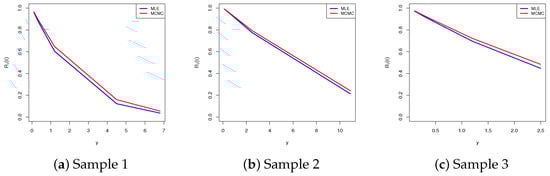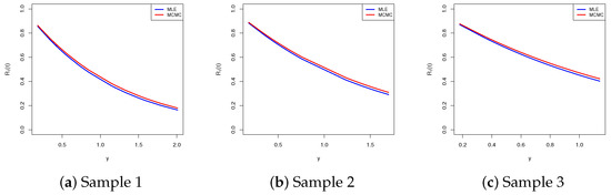 Another objective of this numerical analysis is to evaluate the derived estimators of the reliability function under normal use conditions . Thus, the actual values of based on sets 1 and 2 at mission time are 0.8653 and 0.5291, respectively. Then, the required computations of the suggested point and interval estimates of via maximum likelihood and Bayes MCMC approaches are obtained. Once the required samples are gathered, using the ’’ package proposed by Henningsen and Toomet [23] in 4.2.2 software, the MLEs of and as well as their 95% ACIs (from NL and NA methods) are calculated. On the other hand, the acquired Bayes MCMC estimates as well as their 95% credible intervals (from BCI and HPD interval methods) of and are evaluated using several choices of as: