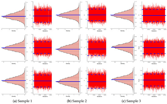 From 40,000 MCMC outputs simulated from each artificial sample reported in Table 3, Table 6 presents useful characteristics of , and : namely, mean, mode, quartiles (, standard deviation (St.D) and skewness. It is clear that the calculated properties of , and listed in Table 6 support our findings in Figure 7.