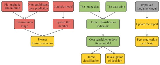 As an invasive alien species, Asian giant hornets are spreading rapidly and widely in Washington State and have caused significant disturbance to the daily life of residents. Therefore, this paper studies the hornets’ spread and classification models based on the GM-Logistic and CSRF models, which are significant for using limited resources to control pests and protect the ecological environment. Firstly, by combining the improved grey prediction model (GM) with the logistic model, this paper proposes a GM-Logistic model to obtain hornets’ spread rules regarding spatial location distribution and population quantity. The GM-Logistic model has higher accuracy and better fitting effect when only a few non-equally spaced sequences data are used for prediction. Secondly, a cost-sensitive random forest (CSRF) model was proposed to solve the problems of hornets’ classification and priority survey decisions in unbalanced datasets. The hornets’ binary classification model was established through feature extraction, the transformation from an unbalanced dataset to a balanced dataset, and the training dataset. CSRF improves the adaptability and robustness of the original classifier and provides a better classification effect on unbalanced datasets. CSRF outperforms the Random Forest, Classification and Regression Trees, and Support Vector Machines in performance evaluation indexes such as classification accuracy, G-mean, F1-measure, ROC curve, and AUC value. Thirdly, this paper adds human control factors and cycle parameters to the logistic model, obtaining the judgment conditions of report update frequency and pest elimination. Finally, the goodness-of-fit test on each model shows that the models established in this paper are feasible and reasonable.
