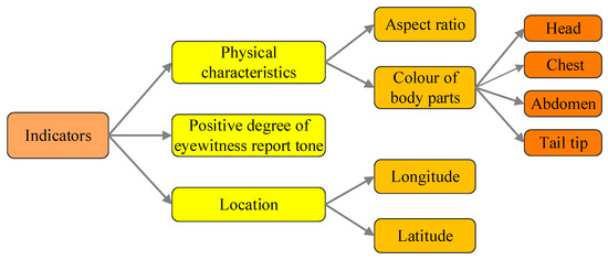 In summary, a total of 8 hornet classification indicators are involved. Thus, we can obtain the framework diagram of the indicator system of hornet classification, as shown in Figure 2.
