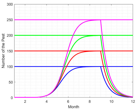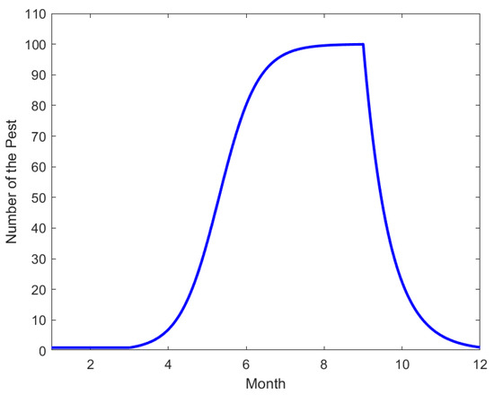 Therefore, we take a cycle of a year and assume that the initial number of hornets in a hive is , and the maximum number of hornets is by the end of August. Assume that the natural growth rate of hornets is a constant r, then . Thus, the logistic growth model is obtained as follows: