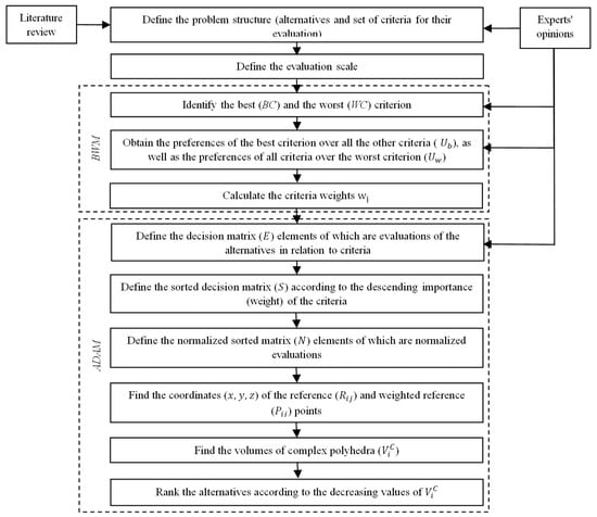 The evaluation and ranking of BMs may help to shed light on the mechanisms and conditions under which they may be successful and how companies can adapt and innovate their BMs in response to changing market conditions. Therefore, another aim of this study was to rank the CE-based BMs that have the highest impact on the key players in the agri-food sector. Because there are multiple factors influencing the success of a certain BM, this is a multicriteria decision-making (MCDM) problem. To solve it, a novel hybrid MCDM model that combines best-worst method (BWM) and a newly developed axial-distance-based aggregated measurement (ADAM) method is proposed in this paper. The BWM method is used to obtain the criteria weights, while the ADAM method is used to rank the alternatives. The ADAM method was developed as a representative of a new group of MCDM methods, namely geometric methods. It is based on establishing alternatives ranked according to the comparisons of the complex polyhedral volumes corresponding to the defined alternatives.