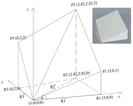 The complex polyhedron shown in Figure 2 is defined by seven points, of which indicates the coordinate origin; points , , and indicate the reference points and points , and indicate weighted reference points. The coordinates of the reference points , , and are obtained on the basis of a vector that defines the value of the alternative according to some criterion. A vector is defined by course, direction, and magnitude. The course of the vector that defines the value of the alternative is defined by the angle in relation to the x axis. The vector is always directed away from the coordinate origin. The magnitude of the vector is defined by its length, which corresponds to the value of the alternative according to that criterion.