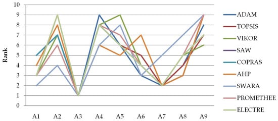The scoring (additive) methods are the simplest MCDM methods that rank alternatives based on values obtained by simple arithmetic operations (addition, subtraction, multiplication, or division). Some of the typical representatives of this group of methods are simple additive weighting—SAW [10], weighted sum model—WSM [11], weighted product model—WPM [12], complex proportional assessment—COPRAS [13] and Additive Ratio assessment—ARAS [14]. In the literature, there are multiple examples of comparing the results obtained with these methods. Some of the most recent ones are in studies carried out by Goswami et al. [15], Hosseini Dehshiri and Zanjirchi [16], and Sahabuddin and Khan [17].