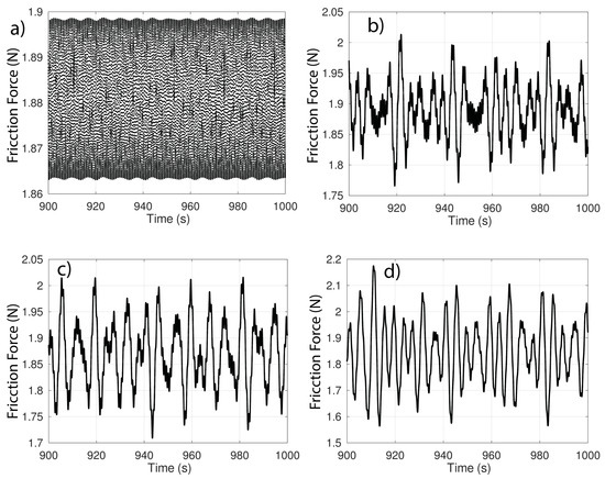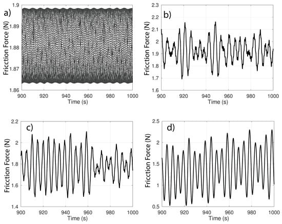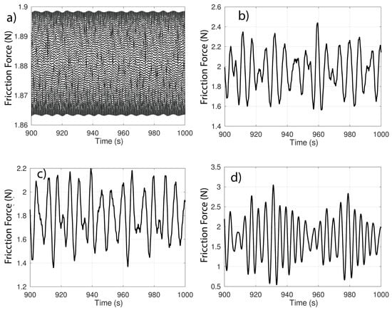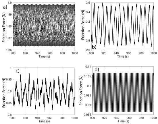 Figure 11 shows almost no change in the friction force, with the oscillation amplitudes remaining practically in the same range for the different values of .
