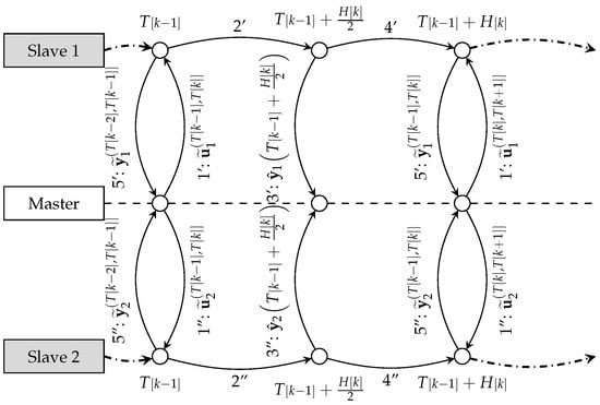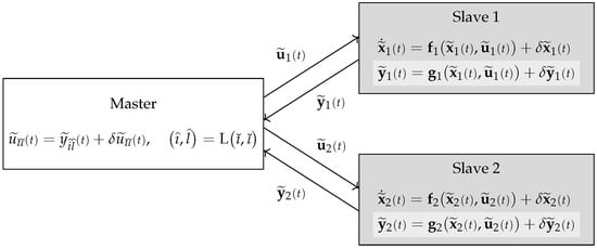 The co-simulation method used for demonstrating the communication step size control is defined in Algorithm 1. It is also shown in Figure 2 to simplify the introduction. Like any other co-simulation master, the method solves the connection Equation (1d) and controls the execution of the co-simulation slaves. The connection equation is solved by the assignment of input signal derivatives (15). The presented co-simulation method allows a parallel execution with a distribution of the calculation performed in for-loops. The communication step sizes are controlled using the PI controller (39) to keep the co-simulation defect (38) constant.