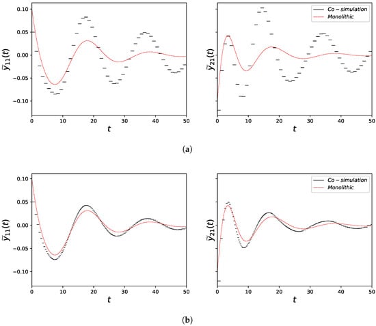 The diagrams show numerical solutions that were calculated with the Jacobi co-simulation method (Algorithm 1). The numerical solutions are compared with the monolithic solution: (a) Fixed step; (b) Variable step.