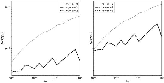 The diagrams show the numerical errors of the variable-step Jacobi co-simulation method (Algorithm 1, (39) and (50), ), different orders of interpolation polynomials and different internal subsystem solvers.