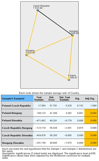Table 6 shows that the debt ratio statistically significantly differs depending on the selected country of the Visegrad Group using the non-parametric Kruskal-Wallis test. Pairwise comparisons demonstrate that the debt ratio differs in four out of six pairs (see Figure 1). As can be seen, the debt ratio does not statistically significantly differ between Polish and Czech companies, as well as between Czech and Hungarian companies using the Bonferroni correction. These results indicate that a multiple regression model for modelling the debt ratio must be created for all member countries of the Central European group.