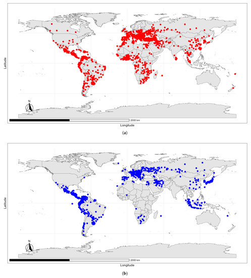 Global distribution of BRD: (a) the red dots show the occurrence of Bovine Tuberculosis Disease (BTD) and (b) the blue dots represent the occurrence of Infectious Bovine Rhinotracheitis (IBR).