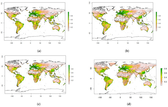 The future (2021–2040) predictions of habitat suitability for BTD and IBR occurrences using ME and BRT are presented in the top and bottom panels of Figure 3, respectively. Compared to the current geographical distribution of habitat suitable for BTD and IBR described above, we observed that the geographical spread of favourable habitat for BTD and IBR extended to western Russia, North America and the Middle East in Figure 3.