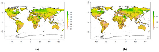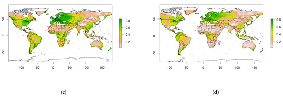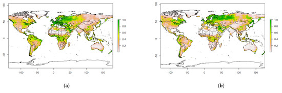 Furthermore, we examined the effects of climate change on the suitability of habitat of BRD for ME. The differences in the suitability habitat index between the current time and the future are shown in Figure 4. Positive values indicate an increasing spread of favourable habitat conditions for BRD, while negative values indicate a reduction in favourable habitat conditions. Greener colours indicate a change in habitat suitability, yellow colours indicate no change, and brownish colours indicate a reduction in habitat suitability for BRD. From Figure 4, we observed that many changes in suitability were made in northern Russia, North America, Finland, Sweden, Saudi Arabia and northern and central Africa.