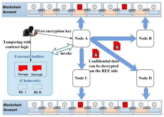 As shown in Figure 1, for the current fabric blockchain node, the smart contract runs in a rich execution environment (REE) with a low-security level, and the contract logic may be maliciously tampered with, resulting in untrustworthy changes to the state data. In addition, data encryption on the REE side lacks root key protection, and malicious applications may monitor the private data-processing process, thereby threatening the security of private data.