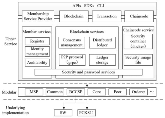 The technical architecture of the Fabric network is shown in Figure 2. The blockchain cryptographic service provider (BCCSP) module is most closely related to the research work of this paper. Based on BCCSP, the common security and cryptographic services of the Fabric network can be implemented, providing secure and pluggable membership service management (MSP), consensus services and chaincode services for upper-layer applications [16,17].