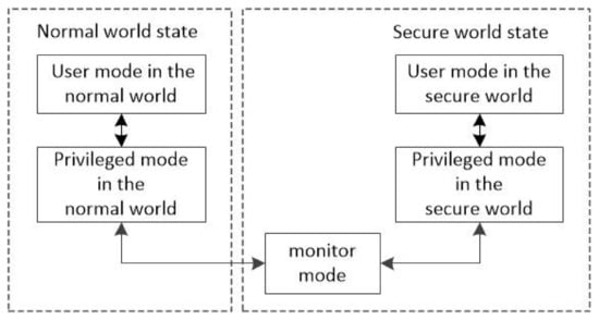 As shown in Figure 3, in addition to the user mode and privileged mode that typically exist in the two worlds, the secure world can also run in a third mode called monitor mode. When the user mode of the normal world wants to obtain services from the secure world, it needs to enter the privileged mode of the normal world first, and then invoke the security monitor call instruction. The processor enters the monitor mode, stores the context of the normal world in the monitor mode, then loads the privileged mode of the secure world, and finally loads the user mode of the secure world and provide corresponding services.