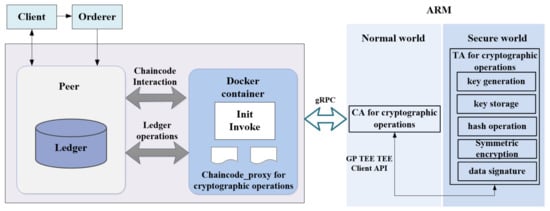 The system architecture proposed in this paper is shown in Figure 4. It includes an order, a peer, and a client. Chaincode_proxy runs as a chaincode on the same node as the peer node. In addition, in our structure, there is also a node for performing cryptographic operations in the secure world of OP-TEE. This node needs to have an ARM processor and support OP-TEE. CA runs in the normal world of OP-TEE and is responsible for processing and forwarding messages from chaincode_proxy and TA. A detailed description of the components we added is as follows.
