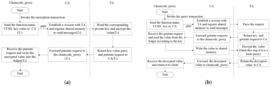 The interaction process between the various parts: (a) invoking encryption transaction; (b) invoking query transaction.