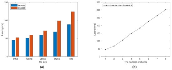 From Figure 8a, it can be seen that for small data lengths (less than 256 KB), the overall time spent performing SHA256 and SHA384 operations is not significantly different. With the increase in data length, the time cost of SHA384 increases significantly faster than that of SHA256. Furthermore, we observe from Figure 8b that the average latency of all single transactions increases with an increasing number of clients.