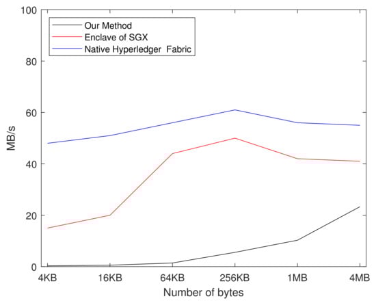 We perform AES128-CBC encryption and decryption on plaintext data in the TA of this paper, in the enclave of SGX and in the native Fabric, respectively. We measure its running time, and convert it into throughput rate to observe the changes in computing performance overhead. Among them, the AES encryption and decryption functions in the SGX SSL extension library (based on OpenSSL) are used in the enclave of SGX. The results are shown in the following Figure 11.