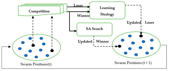 The particles in the CSO learn from competitors chosen randomly rather than from the global or personal best position. First, in each cycle, the population of particles is randomly split into two groups of equal size. Then competition is established between the particles in each group. The particle with the highest fitness value at the end of the competition is declared the winner, and it is then instantly advanced to the following iteration. Conversely, after learning from the winner, the loser adjusts its position and velocity. The location and velocity of the loser are updated mathematically as follows: