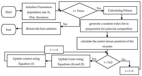 | Initialize positionaccording to lower and upper bounds. while (termination condition is not met) for (each particle ) Evaluate the New and recorded them as fitness if () then update the Best_Position and Best_Fitness end-if end for (each Swarm in (Search Agents/2)) Randomly select particles from If is better than then else end if for (each dimension) Update Loser Position By Equations (4) and (5) Update Winner Position By Equation (1) end for end for end while |