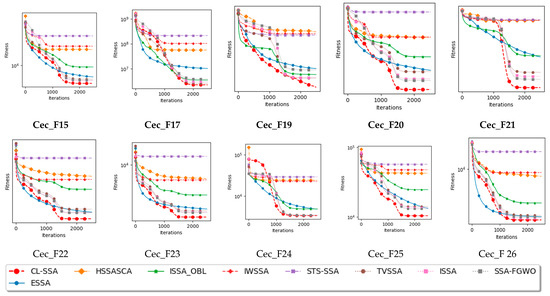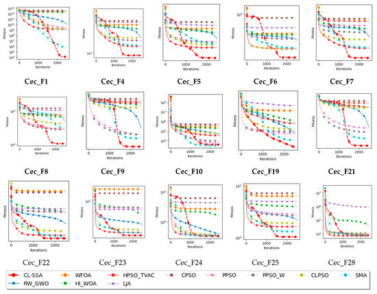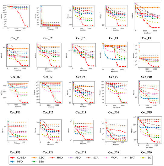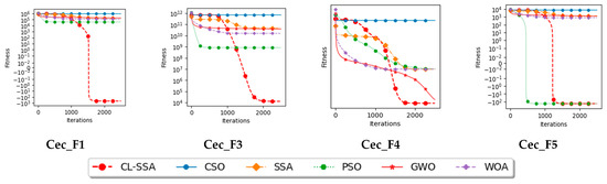 In practice, assessing the computing complexity of metaheuristic approaches is critical. The proposed CL-SSA and other algorithms (e.g., SSA, CSO, PSO, GWO, WOA and SCA) take O () time to initialize the population, where denotes the size of the population, and the symbol is used to represent the dimension of the problem being solved, corresponding to the number of variables involved. The formula is used to calculate the fitness of search agents for all algorithms, where is the objective function for a given issue. The complete procedure takes time to reproduce. The computational complexity of CL-SSA is where dim is the problem dimension and is the number of Search agents. Depending on this, the overall complexity . SSA, CSO, PSO, GWO, and SCA algorithms have a computational complexity of . As can be seen in Table 2, the proposed CL-SSA and other algorithms have a relatively short operating time.