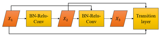 Dense Connected Convolutional Networks (DenseNet) establish the connection between different layers, achieve the reuse of features, and have excellent performance [28]. Introduction of dense blocks in U-Net can improve network fitting to better solve the limitations associated with missing details in medical images. The schematic presentation of a two-layer dense block structure is shown in Figure 4. The dense block in the first layer includes three parts: the BN layer, ReLU activation function, and 3 × 3 convolution operation. Each layer of the network in the dense block is connected to the next layer but also to all subsequent network layers so that each layer can accept the remaining layers as additional data input.