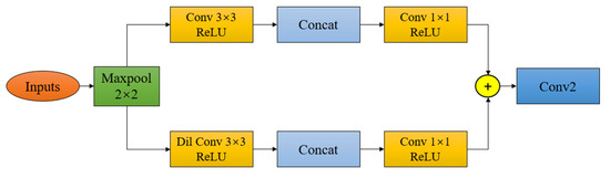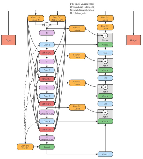 The DNet module shown on the left of Figure 6 is the introduced dense structure. A dilated convolution with a convolution kernel size of 3 and dilation rates of 3 and 5 is adopted to form a sawtooth structure. The topology of global dense connections is shown by the solid lines on the left half of Figure 6, where each layer of the network is connected to all the following layers, making full use of these features. The loss of background information in the pooling process is reduced by using the average pooling method. The topological structure of local dense connections is shown by the dashed line on the left part of (Figure 6). After dimensionality reduction by 1 × 1 convolutional layer, feature maps with large mesoscale changes in the feature extraction part are spliced together with the output of the backbone network and input into the upsampling part. Then, the maximum pooling method is adopted to retain the information of feature maps with different scales. The feature map representation method of the pooling process is shown in Formulas (2) and (3):