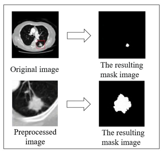 The selected images first marked the positions of pulmonary nodules in the images according to the annotation file in the case folder. Given the small proportion of pulmonary nodules in the original CT images, a quasi-imbalance problem would be generated, thereby affecting the network’s training process. Therefore, to reduce the influence of other lung tissues on experimental results, the original image obtained was cropped. Based on the center point of the nodule position provided in the annotation file, the sizes of the original and labeled images were cut to 96 × 96 pixels to completely retain the nodule information. The pretreatment experiment results are shown in Figure 7.