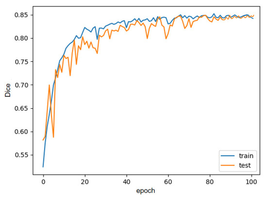 In Figure 8 and Figure 9, when Epoch = 100, changes in the Dice similarity coefficient value (DC) and loss function (Loss) curve of the network on the verification set tended to be stable. Therefore, the number of training iterations was set to 100. Moreover, for the network to be adequately trained, the Step for each Epoch was set to 500.