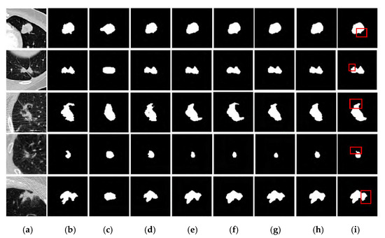 Combined with the comparison experiment, lesion visualization results for pulmonary nodule images are shown in Figure 10. Figure 10a–i show the original image, the gold standard segmentation of pulmonary nodules labeled by professional physicians, and the segmentation results of the FCN, SegNet, U-Net, ResNet, UNet++, Densenet and MDRU-Net models for pulmonary nodules. The parts in the red box highlight the finer segmentation of the proposed MDRU-Net as compared with those of other models, and the segmentation results are more intuitive.