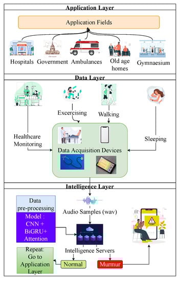 The application layer is the first layer in our proposed architecture, as presented in Figure 1. This layer shows the application areas where our proposed DL model can be applied to prevent sudden abnormal heart conditions and make the user aware of the same, so that precautions can be taken. These applications include hospitals, government offices, ambulances, nursing homes, and gymnasiums—but they are not limited to them. Hospitals are the primary field of application as there is a frequent need to measure the heart sounds of patients feeling inconvenienced in terms of health. Patients not in intensive care can be given devices that continuously monitor their heartbeat sound in hospitals. This helps prevent unwanted scenarios where a patient might suffer from a severe heart ailment just because they are not deemed necessary to be in intensive care. Similarly, ambulances and nursing homes that do not have expensive and intensive equipment to measure heart sound, such as those in rural or poor regions, can be provided with the proposed cost-effective sensors where our DL model can alert upon abnormality detection and proper care may be provided. In gymnasiums, for instance, such devices can be given to gym users to prevent sudden heart attacks as the device would alert any peak in heartbeat, denoting the abnormal condition in the user. Hence, the user can stop exercising and reduce putting more strain on their heart by taking a rest. In government organizations, too, such devices can help provide a timely diagnosis to the poor, who generally have to choose government hospitals for their treatment. This might not be a problem in developed nations, but in developing ones, many government-run hospitals need proper facilities.