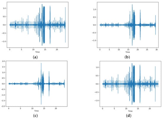 Figure 2. Data augmentation of heartbeat audio sounds. (a) Original audio. (b) After time stretch. (c) After pitch shift. (d) After audio shift. - Pitch shift—this transformation is used to change the pitch or perform pitch shift by changing the sound pitch up or down without altering the tempo. We can change the audio signal by changing the pitch by reducing or increasing the semitones. We randomly select the semitones in the range of −4 to +4. Again, we set the probability of application of this transformation to 0.5, which means that the transformation is only applied with half the probability. Figure 2a,c shows the effects of pitch shift.