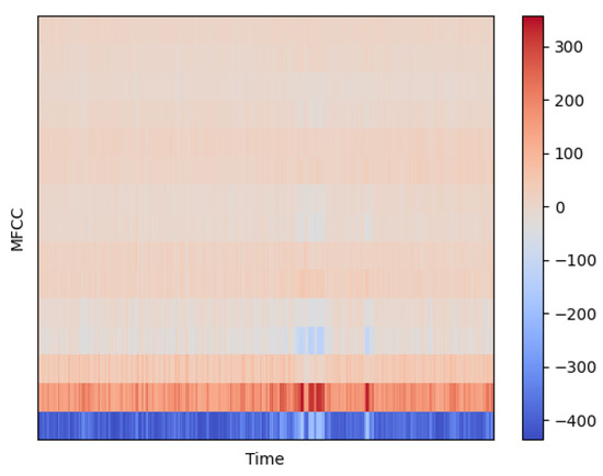 These MFCCs can be fed directly into the DL model. The model tends to learn meaningful features without facing the problem of vanishing gradient, which significantly reduces the time of reliable training models. Figure 3 represents the MFCC for a audio signal represented in Figure 2a. Visually, it is a heatmap representing tge time and coefficient (color represents the coefficient value) on their x-axis and y-axis, respectively. However, it is to be noted that the shown MFCC has only 15 coefficients (for better understanding), whereas, for our proposed work, we are using 70 coefficients. After the conversion of the raw audio data file to MFCC, we obtain an MFCC from an audio file read for 25 s with a sampling rate of 22,050, having the dimension of (1077, 70) because we are using hop_length = 512 and number of samples per FFT to be 2048 while calculating the MFCC. This compression of data is represented below.