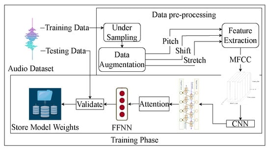 The third layer in the proposed architecture is the intelligence layer, which deals with applying the proposed DL model to provide feedback on the data obtained from the data layer. As shown in Figure 1, the raw audio samples are passed to intelligence servers that include the inference model. This inference model performs the data preprocessing and feature extraction (to get the MFCC) and passes it to the DL model consisting of CNN + BiGRU with an attention model for inference on the audio sample. The result of this inference is evaluated and an alert is sent to the user if there is a detection of murmur or abnormality. If the audio is normal, the inference process starts again with more recent data. Hence, the intelligence layer is the core layer of the proposed architecture. We need to train the model first for the model to undergo inference. Figure 4 describes the training phase. We have first split the raw audio data into training and testing data at a 70:30 ratio. Moreover, we have applied undersampling to counter the class imbalance problem. The reason is that the audio samples of the murmur class are less available. The dataset description mentioned in Section 4.2.1 gives a more detailed process. Later, we apply data augmentation to this training data to counter the overfitting problems. After data augmentation, we extract the MFCC from the obtained audio waves and pass it to the model. Now, the model is trained and validated against the test data to measure its performance against various evaluation metrics explained in the result and analysis. After the model training, finally, the model is stored on a disk for getting equipped with smart sensors.