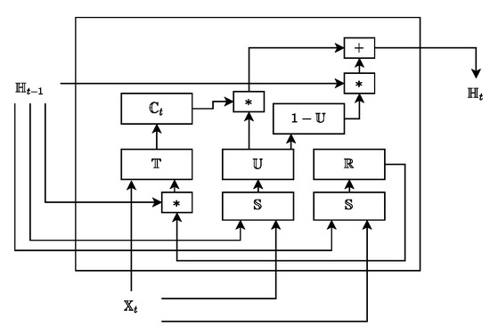 - GRU—they continually capture long-term dependencies in data using memory blocks. Each memory block has two gates, the update, and the reset gate, for performing the operations of updating the current memory cell state and deciding the amount of previous information to forget, respectively. The equations followed by a GRU unit are as follows.where the update gate is denoted as and the reset gate is denoted with , respectively. Further, the hidden state is denoted with for a timestamp t, means cell state for time t, and input features are denoted with , which are fed to the cell. , , , , , are the weights, and , , are the biases, which are obtained from the backpropagation algorithm (equipped in the neural network). × represents matrix multiplication and ∗ denotes element-wise dot product. is the tanh and is the sigmoid activation functions to show the probability of the neuron being active or inactive, respectively. Figure 5 represents the GRU unit.