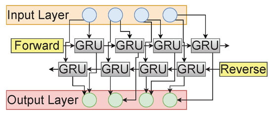 Figure 6. Bi-GRU architectural view.The BiGRU structure can be individually broken down into two different layers, i.e., the forward propagation layer and the backward propagation layer. Both layers differ only in the direction of the context they witness before making a prediction. The forward layer predicts a timestep considering the context before that timestep, i.e., the previous context. In contrast, the backward layer predicts a timestep considering only the context that occurs after that timestep i.e., future context. Hence, at any timestep, we have both the past and future context; consequently, the model makes better predictions. As seen in Figure 6, the GRU unit used in each layer is the same as in Equation (18). Now, let us consider the hidden output at any timestep ‘t’ for the forward layer’s GRU unit and the corresponding backward layer’s GRU unit to be and , respectively. The output at the timestep, say , can be given as follows.where , , and represent the weight matrix between the forward layer and output, the weight matrix between the backward layer, and bias for the output layer, respectively. represents the tanh activation function. - Attention—the attention mechanism has applications in word recognition, image captioning, and many other related tasks. With the help of the attention mechanism, BiGRU can decide which part of the sound clip should be ”attended”. The overall mechanism of attention helps the deep learning model to be decisive in specific time steps or parts of data while ignoring irrelevant parts or time steps of data. The attention mechanism works based on extracting discriminative information, helping to improve the performance of RNN/GRU-based architecture by focusing on certain parts of the data. The attention mechanism captures discriminative information for our problem of sound classification as the complete data does not contribute equally towards representing a particular class of sound clip. The attention mechanism provides aid to traditional BiGRU by significant improvement of the performance of the deep learning model with reduced computational cost. The attention mechanism is helpful in the generation of a dense vector that represents the output produced after proper attention is given to the required timesteps. The equations of the attention mechanism are as follows.where is the hidden state column vector for the given input, L denotes the number of cells in GRU network, and is the input. Further, an attention mechanism is adopted to capture the hidden states of the network, as shown in Equation (21)where the attention layer’s output is represented by and and are trainable weights and biases.