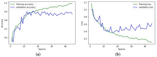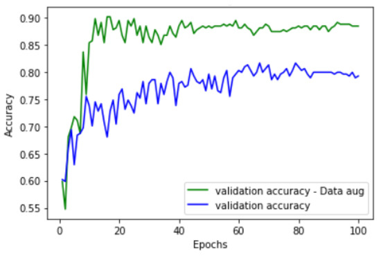 Finally, data augmentation improves the validation accuracy to a great extent and helps combat overfitting. Figure 13 shows this positive effect of data augmentation.