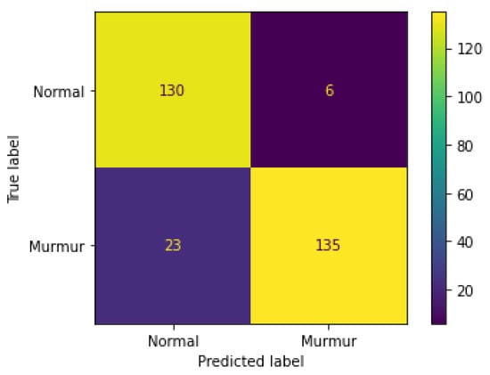 - True Positive ()—labels that are predicted as murmur by the model are truly murmur (bottom right cell of the confusion matrix).
