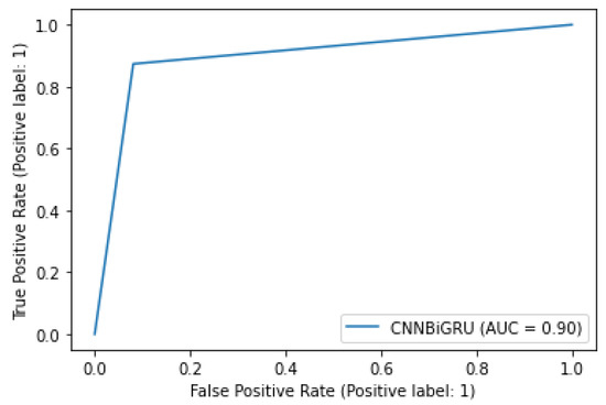 Table 2 illustrates the above-mentioned performance metrics for murmur and regular heartbeat sounds using our proposed CNN+BiGRU with an attention mechanism against other deep learning models. Figure 10 illustrates the receiver operating characteristic (ROC) curve of our proposed architecture along with the area under the curve (AUC) on the validation set to be 0.9, indicating that the model performs exceptionally well on the validation set. This AUC parameter tells us how much the model can distinguish between different classes; hence, the more the area, the better the model. As is evident in Table 2, the AUC of the proposed architecture outperforms the other models.