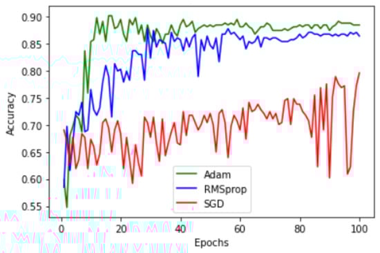 Figure 11 compares various optimizers used with the proposed architecture during training. We can see that the Adam [60] optimizer produces the best results, as is expected because Adam optimization is an extension of the stochastic gradient descent (SGD) and has the benefits of both the Adagrad and RMSprop optimizers. This results in Adam reaching the optimum results in a short time frame.