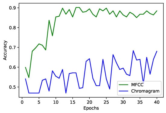 Furthermore, we can also see from Figure 12 the reason behind selecting MFCC as a feature selector. It is seen that the training with MFCC is very stable and converges quickly. On the other hand, the training with chromagram as a feature selector gives us very slow and unstable training.