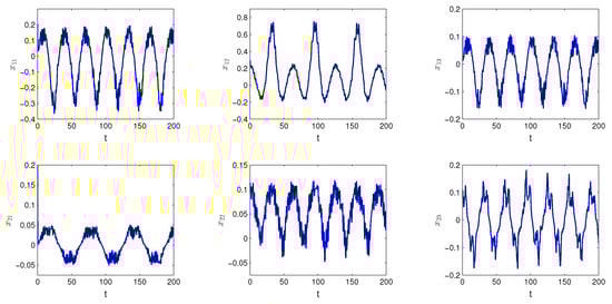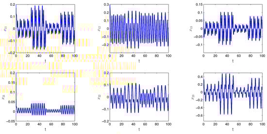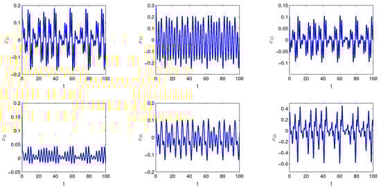 Let us take into account the SICNNs (26) with The functions and are the same as in Example 1. The period ω is equal to In Figure 4, the graph of the solution of SICNNs (26) with the length of step and the degree of periodicity is demonstrated.