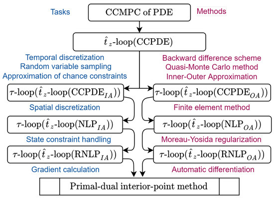 Figure 2 shows our implementation details. On each prediction horizon, the time and space discretization as well as random sampling are applied to obtain the finite dimensional representation of smoothing inner and outer approximations of the PDE-constrained optimization problem, (RNLP) and (RNLP), respectively. Note that the samples are generated only once and then used to reformulate the initial problem on each prediction horizon. Subsequently, the Moreau–Yosida regularization is employed to regularize (RNLP) and (RNLP). The regularized problems are then solved using Algorithm 1 for decreasing values of the approximation parameter coupled with a sampling strategy for the random variable to evaluate the expected values in Equation (20) and their gradients and .