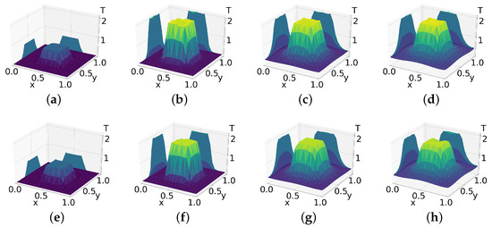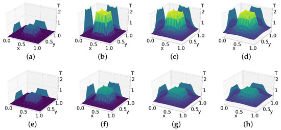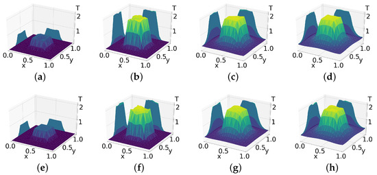 Mean temperature realizations of optimal control on the first prediction horizon by ; (a) , ; (b) , ; (c) , ; (d) , ; (e) , ; (f) , ; (g) , ; (h) , .
